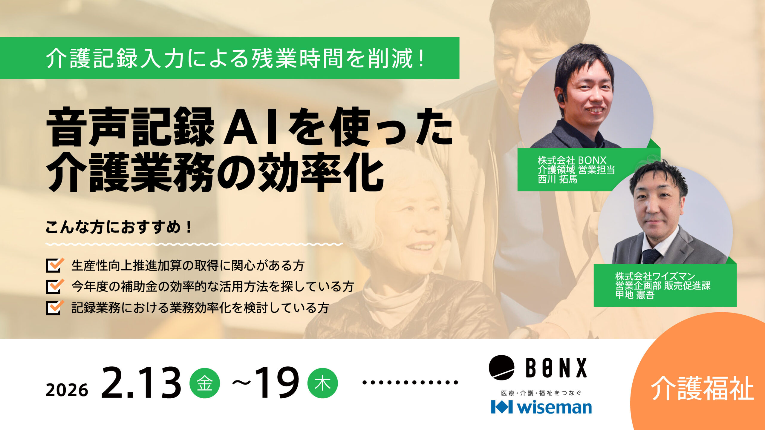 株式会社BONXは、この度、株式会社ワイズマン様との共催セミナー「介護記録入力による残業時間を削減!音声記録AIを使った介護業務の効率化」を2026年2月13日(金) 〜 2026年2月19日(木) に配信することをお知らせいたします。
